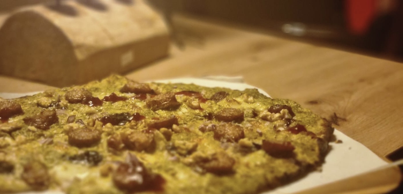 Knuspriger Flammkuchenboden mit Pinkel, Grünkohl-Pesto, roten Zwiebeln und Mozzarella.